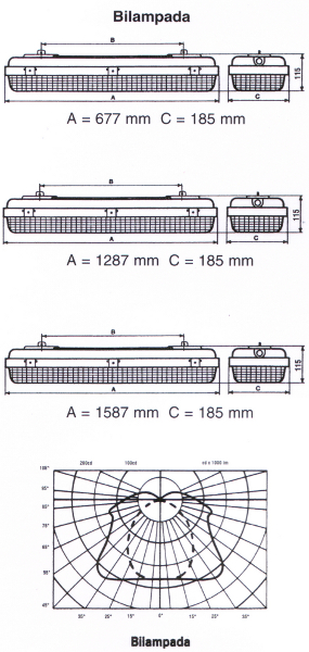 Ceiling lamps for fluorescent wired and power factor improved, polyester body reinforced in fibre glass, polycarbonated diffuser.