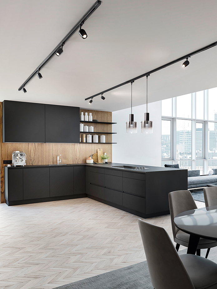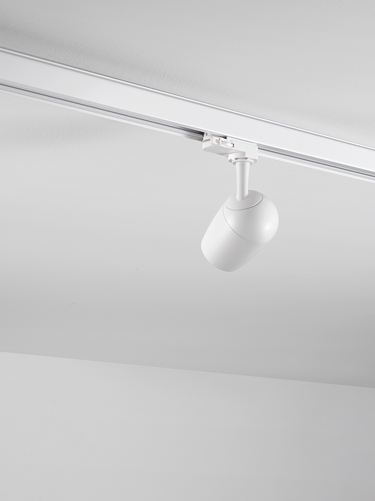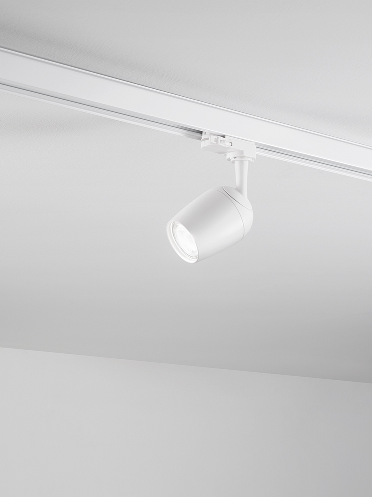 Adjustable aluminium spotlight suitable for installation on three-phas rail tracks, matt black powder-coated. 350-degree swivel head adjustable to 300 degrees. Assembly and disassembly without tools.